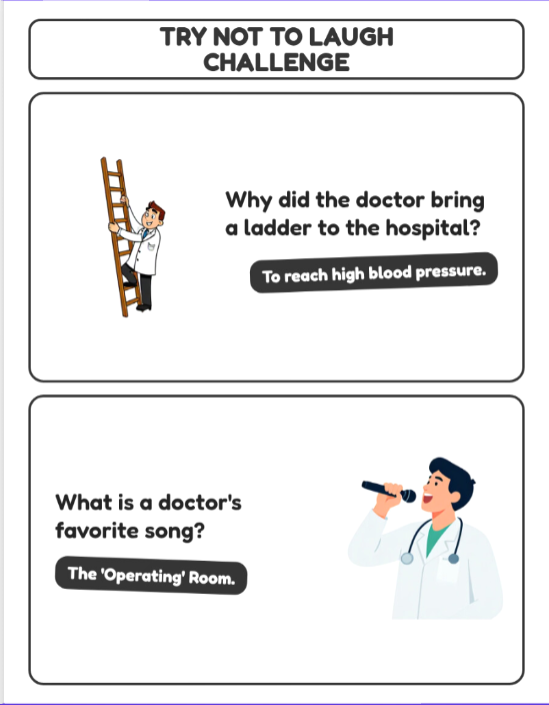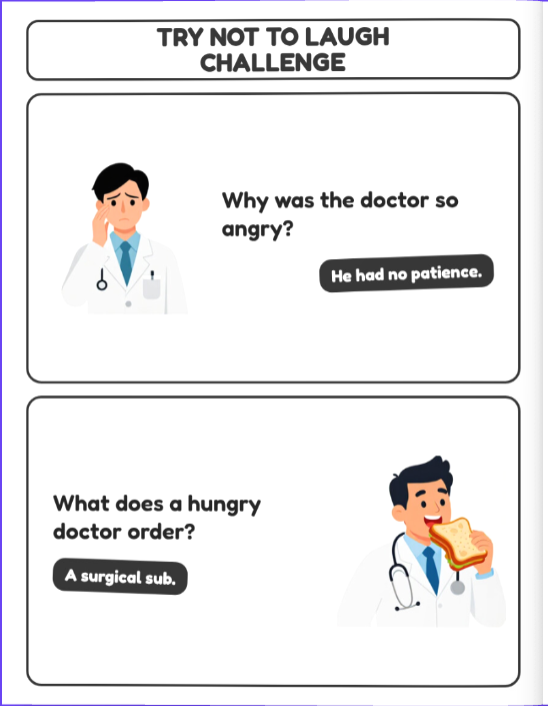 A hilarious medical-themed joke book for kids, featuring funny riddles about doctors, nurses, and hospital life.
